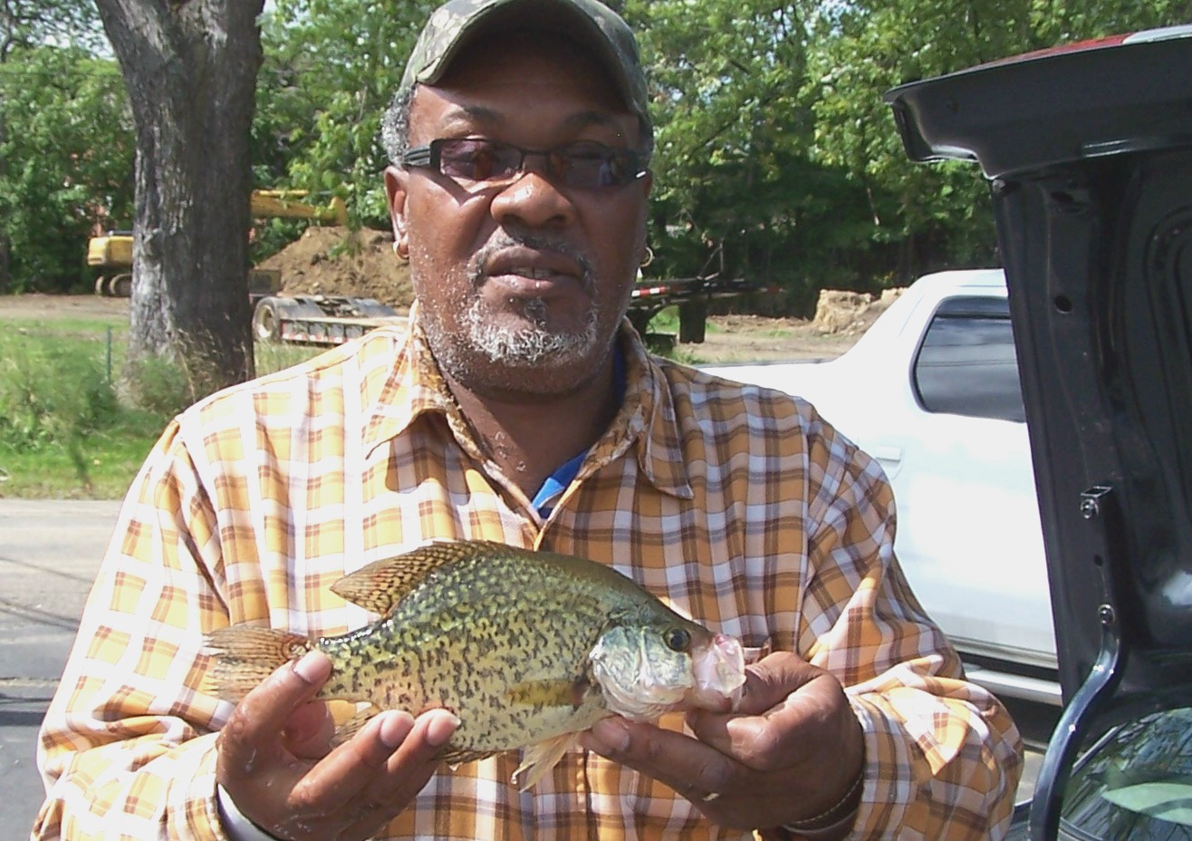 Here is a picture of James with one of the many crappie they are catching in the bay from shore. This is an 11 inch crappie.