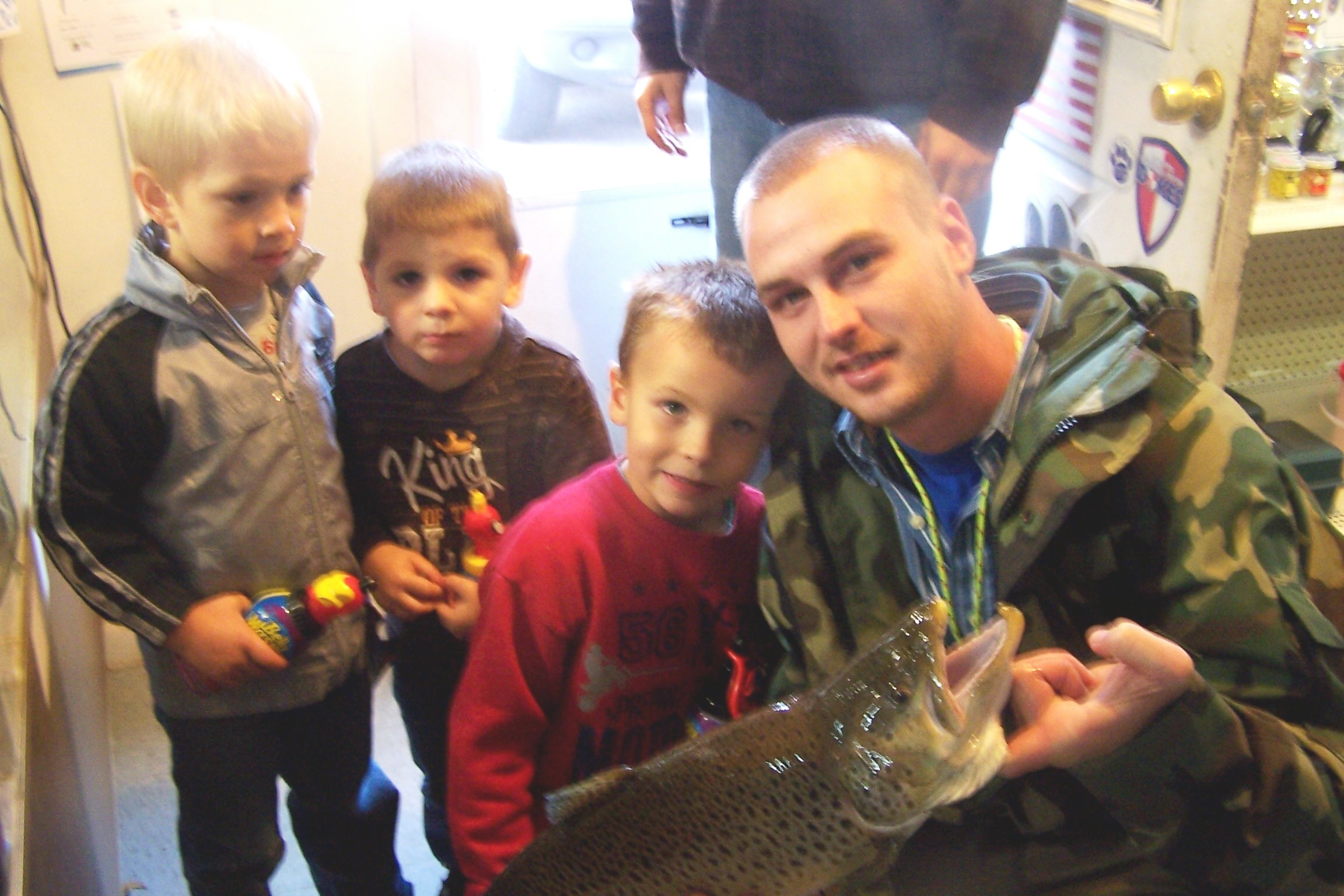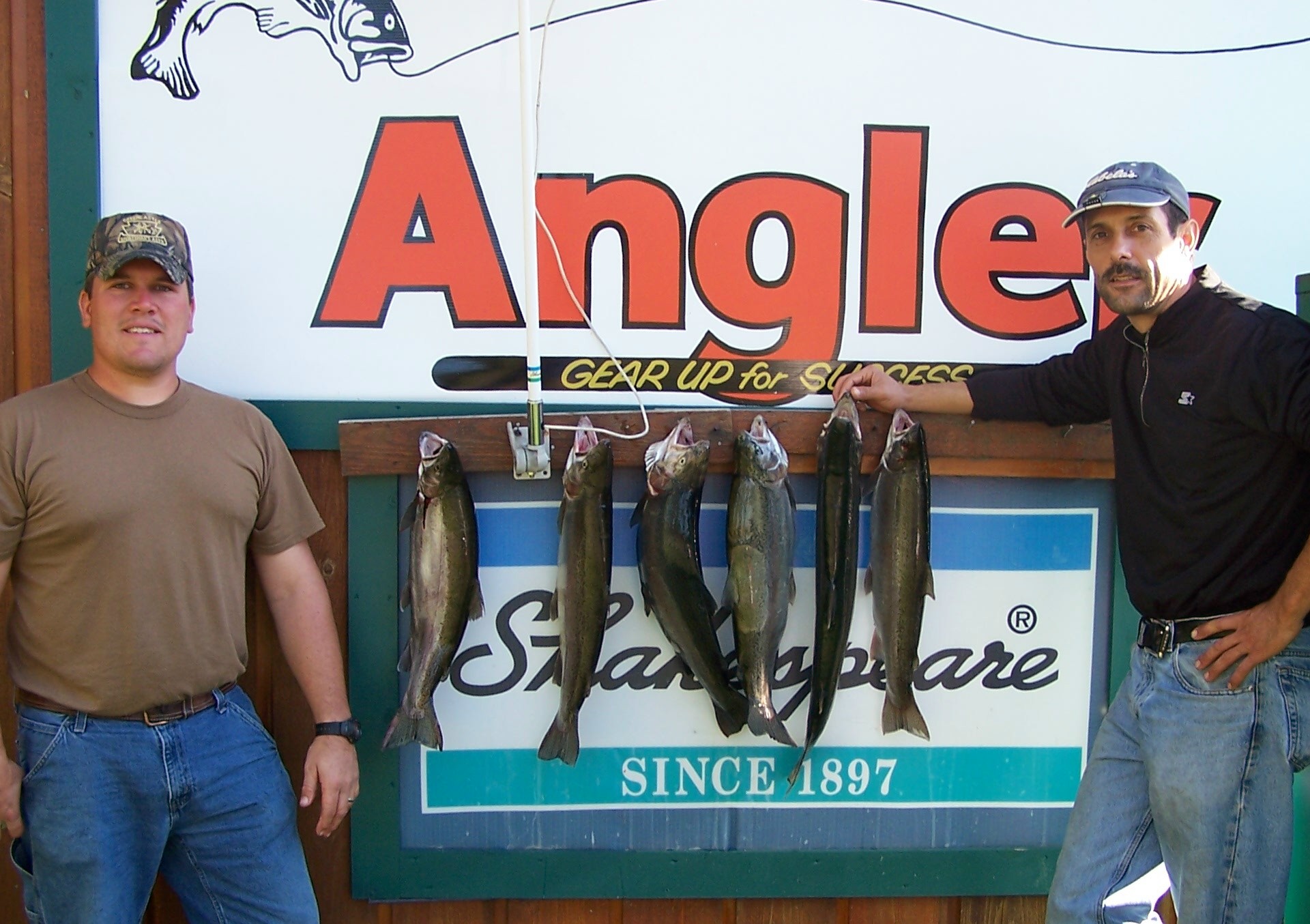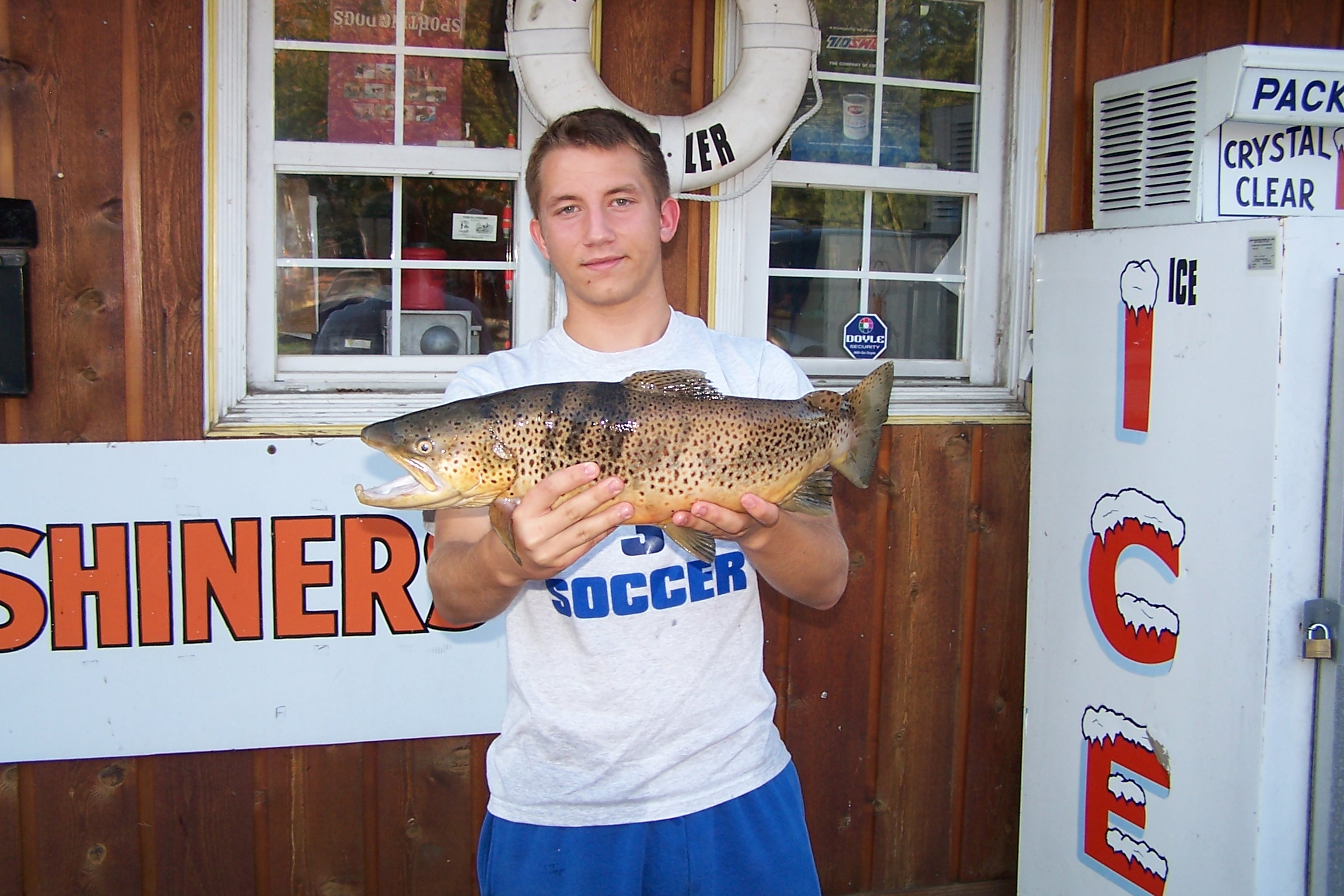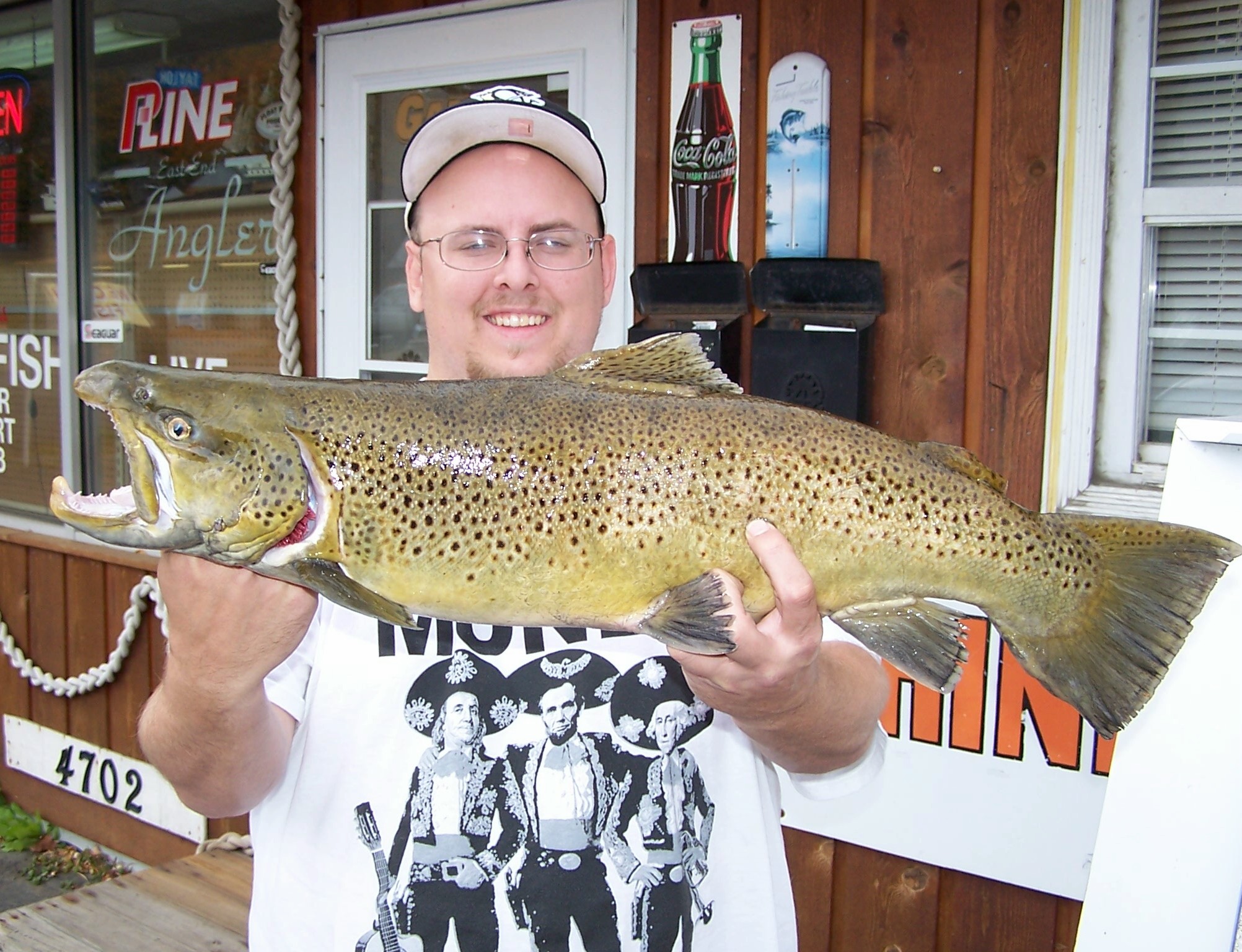 The next 2 pictures are of Tim Hill with a 11 3/4 lb Brown Trout and a 12 1/2 lb Lake trout caught on 16 MIle. Remember this if you catch a Lake Trout. Take a picture and let it go. They are not good for you to eat. They have the highest pcb & mercury count of all the fish in the Lake.